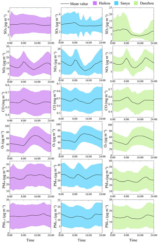 Despite the fact that each pollutant’s concentration varied, except for SO2 and O3, the diurnal trend in the variation in the concentrations of the other pollutants showed the characteristics of a bimodal pattern, with double peaks and double valleys (Figure 4). The concentration of SO2 slowly increased at night to reach a peak at about 8:00 and then decreased, with the fastest rate of decline occurring in the afternoon and gradually decreasing to the lowest value of the day in the evening. After increasing steadily from a valley point of 8:00, the concentration of O3 peaked at 78.04 μg m−3 at 16:00. This may have been caused by the highest temperatures and the strongest sunlight occurring in the afternoon [36]. The trends in the variations in NO2 and CO were the opposite to that of O3. O3 chemistry is complicated: reducing NOX can either increase O3 (under the NOX limit condition) or decrease O3 (under the VOC limit condition) [37]. Around 4:00 was the first valley in Sanya of NO2 and CO (7.78 μg m−3 and 0.45 mg m−3), which then increased to around 8:00, which is when the peak concentrations of these pollutants occurred in the three cities (13.9 μg m−3 for Haikou and 0.59 mg m−3 for Danzhou). The concentrations decreased to the lowest values in Sanya (5.58 μg m−3 and 0.50 mg m−3) at around 14:00, then increased again in the middle of the night to concentrations slightly below the peak in the morning. The two valleys of particle matter, 21.95 μg m−3 and 21.71 μg m−3, appeared in Sanya at 7:00 and 15:00; and the peak values of 33.33 μg m−3 and 16.67 μg m−3 appeared at about 20:00 in Danzhou and Haikou, respectively. The pattern of urban air pollution was a bimodal distribution of particle matter, CO, and NO2 in front and behind the O3 peak [38].