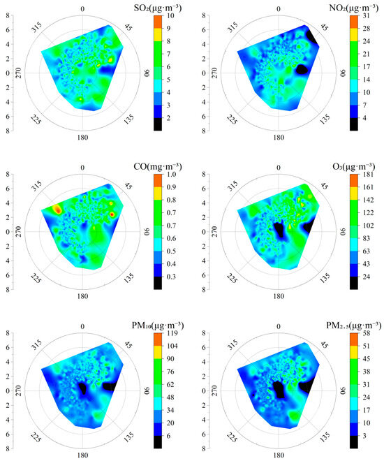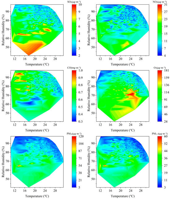 The photochemical reaction rate accelerated in the summer and fall due to the more intense solar radiation, longer daylight hours, and higher temperatures. These may have increased the amount of sulfate and nitrate particles in the atmosphere, which become secondary sources of PM2.5 and PM10. Simultaneously, an increased amount of particulate matter is carried into the atmosphere from the surface, serving as a primary source of PM2.5 and PM10 [39]. Under high-temperature conditions, diffusion is accelerated by atmospheric cross-ventilation and turbulence [40,41]. As shown in Table 1, there was a strong negative correlation between T and SO2, NO2, CO, and PM2.5, suggesting that the higher the temperature, the lower the concentrations of these pollutants, while a strong positive correlation between O3 and T was found in the summer, indicating that T influenced the O3 concentrations through changes in mass fluxed through the upper boundary layer and gas phase chemistry, as well as vertical diffusivity and RH [42]. Below 26 °C, the concentrations of SO2, NO2, CO and PM2.5 were significantly higher than those at 26 °C. In winter, when the T was between 11 °C and 15 °C and the humidity was about 65%, the PM10 concentration exceeded 100 μg m−3. Because the ground was cooler in winter, the increase in temperature led to a thermal inversion layer, which prevented atmospheric movement and could have led to the accumulation of pollutants [43].