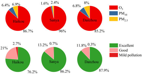 Figure 7 shows the statistical results of the daily average AQI values of the three cities in Hainan province from 2018 to 2022. On the basis of the daily average AQI, three grades of air quality could be distinguished: excellent, good, and mild pollution. As can be seen in Figure 7, during the study period, the proportion of the air quality conditions in the three cities was excellent > good > mild pollution. Danzhou had the best air quality, with only 0.278% of the study period having mild pollution, 11.8% of the period having with good air quality, and 87.9% of having excellent air quality. The air quality in Sanya was second, with 86.2% and 13.2% of the study period having excellent and good air quality, respectively. Among the 1824 days sampled, only 12 days were mildly polluted. The number of days with excellent air quality in Haikou was 76.2%, while the number of days with mild pollution was 2.75%.