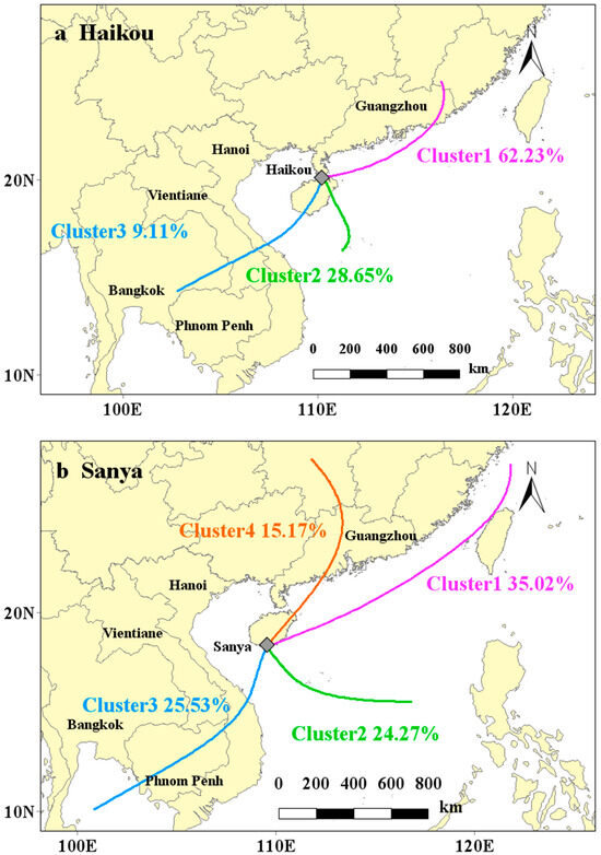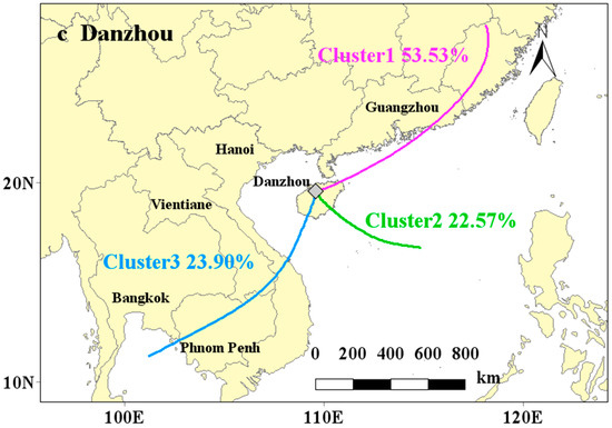 The air trajectory clusterings for Haikou (a), Sanya (b), and Danzhou (c) produced using the(Hybrid Single-Particle Lagrangian Integrated Trajectory (HYSPLIT4) model.