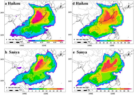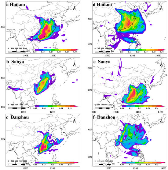 The northeastern portions of Hainan hosted the majority of the potential sources with high WPSCF values (Figure 9a–c). For Haikou, the northeast (Guangdong, eastern Guangxi, eastern Hunan, northwest Jiangxi, and eastern Hubei) had high WPSCF values (Figure 9a). Since long-distance transport was the primary contributor to air pollutants, these observations agreed adequately with the backward trajectory analysis. Southern Hunan and the north-central part of Guangdong were the primary potential sources for Danzhou, having high WPSCF values. These places were located along the route of the dominant cluster 1 (Figure 8c), which had elevated PM2.5 levels. According to cluster 1’s dominance (Figure 8b), the likely source regions for Sanya that had high WPSCF values were concentrated in Guangdong and southern Hunan.