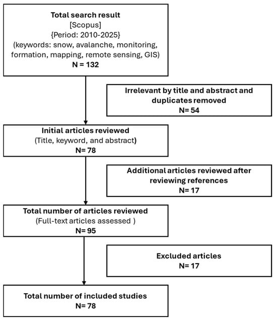The search initially yielded a total of 132 articles. To refine the search results, titles and abstracts were screened for relevance to the topics of avalanche monitoring and formation using remote sensing. Articles were also checked for duplicates during this phase. This initial screening process resulted in the exclusion of 54 articles, leaving 78 articles for more detailed review. The selected articles underwent a thorough review based on their abstracts, titles, and keywords to further assess their suitability for inclusion in the study. This review was complemented by an additional screening of references from these articles, identifying 17 more articles potentially relevant to the research questions. A total of 95 articles, including those identified through reference checking, were subjected to a full-text review to determine their direct relevance to the scope of this review. This stage assessed each article’s content in depth to ensure that it provided significant insights into the use of remote sensing in avalanche research. Articles that did not meet the specific criteria for relevance and scientific rigor were excluded from the review. This process resulted in the exclusion of 17 articles, culminating in 78 articles being included in the final analysis.