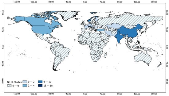 The geographical distribution of the relevant literature (Figure 2) on remote sensing in snow avalanche studies was mapped using QGIS, employing a classification approach based on natural Jenks symbology. This classification highlighted five distinct classes of publication frequency across various countries: 0, 0–2, 2–4, 4–13, and 13–18 publications. The geographical analysis of the relevant literature reveals a broad global engagement in avalanche research using remote sensing technologies, with Switzerland, China, and India leading in contributions. These countries show a higher concentration of studies, indicating established research communities and ongoing projects. Norway also contributes significantly, reflecting robust research activities. Countries such as Canada and Turkey demonstrate steady involvement, while Austria, the United States, France, Iran, Kazakhstan, Pakistan, and Romania show lighter yet meaningful participation. Further, nations like the Czech Republic, Germany, Denmark, Finland, Kyrgyzstan, and Serbia are identified as having emerging interests in this field, each contributing foundational studies that may pave the way for increased research efforts.