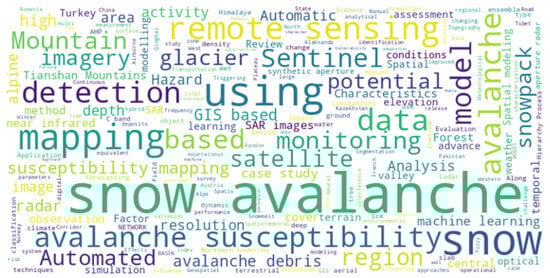 In our systematic review focusing on the application of remote sensing techniques in avalanche monitoring, the use of a word cloud provides an intuitive and visual summary of the thematic focus within the compiled literature. This word cloud (Figure 4) was developed using Python 3.9.0 libraries (Rispy and Word Cloud). It was specifically generated from terms extracted from the titles of the reviewed articles, with the font size of each term in the cloud corresponding to its frequency of occurrence. This visual representation allows for the immediate recognition of the most emphasized topics within the field. In the word cloud, the term “snow avalanche” appears as the most frequently used, prominently displayed due to its larger font size. This highlights the central focus of the collected literature, underscoring the primary subject of study. Following closely are “remote sensing” and “mapping”, which also appear in larger fonts, reflecting their significant roles in the research landscape. These terms, along with others in the word cloud, outline the key methodologies and areas of interest that researchers have focused on over the selected period.