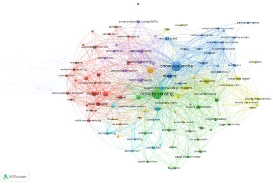 In the context of our systematic review of remote sensing techniques for avalanche monitoring, the clustered co-occurrence map (Figure 5) serves as a pivotal analytical tool, providing a visual representation of the relationships and thematic concentrations within the collected literature. The map was developed using VOSviewer version 1.6.20, which is an open-source software used for bibliometric analysis. This map is constructed using terms extracted from the titles, abstracts, and keywords of the compiled articles, revealing the intricate network of topics that form the foundation of the current research in this field. Node size in this map corresponds to the frequency of term occurrence across the literature, highlighting the most prominent topics discussed within the field. Each node represents a unique term, with its size reflecting how often the term appears, thus indicating its relevance and popularity in avalanche-related studies. Edges between nodes depict the co-occurrence of terms within the same papers, providing insights into how concepts are interconnected. The physical proximity of nodes on the map, determined by the strength of term associations, illustrates the closeness of the relationship between different research themes. Significantly, the map is organized into seven distinct clusters, each representing a cohesive theme within avalanche research as informed by remote sensing techniques. The blue and green clusters are particularly notable, emerging as the largest clusters with “remote sensing” positioned as a central hub. This central positioning underscores the critical role of remote sensing as a nexus in avalanche research, linking various subfields and methodologies. The prominence of these clusters reflects the extensive application and integration of remote sensing technologies in understanding and addressing the complexities of avalanche phenomena. The visualization provided by this co-occurrence map is invaluable in our review. It not only clarifies the current landscape of research but also aids in identifying gaps and emerging trends. By analyzing the density and spread of topics, researchers can better understand the evolution of the field, assess the impact of new technologies, and guide future studies toward areas that promise significant advancements in avalanche prediction and monitoring. This strategic insight empowers researchers to build on the existing body of knowledge, pushing the boundaries of what remote sensing can achieve in the context of avalanche safety and management.