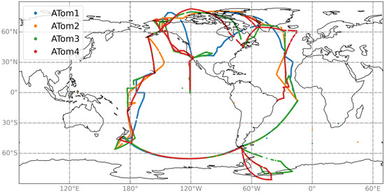 The NASA Atmospheric Tomography Mission (Atom [28]) is an observation mission that covers four series of flights over the Pacific and Atlantic Oceans. This mission aims to improve our understanding of the composition of the remote troposphere in four seasons: August to September 2016 (ATom-1), January to February 2017 (ATom-2), September to October 2017 (ATom-3), and April to May 2018 (ATom-4). The aircraft carried out continuous flights at altitudes ranging from 0.2 to 1.2 km. Figure 1 shows the flight paths of ATom-1~4. The aerosols of interest in this study include ammonium, nitrate, BC, OA, and sulfate, which were measured from ATom directly. The mass concentrations of OA, sulfate, nitrate, and ammonium were measured by the Aerodyne High-Resolution Time-of-Flight Aerosol Mass Spectrometer (AMS [29,30,31]). BC was measured using the Single Particle Soot Photometer (SP2 [32]). The AMS and SP2 data were merged to form a 10 s mean. We only use data below the dynamic tropopause height and filter out concentrations above the 97th percentile from every species in the dataset to eliminate the impact of any plumes that cannot be captured by Eulerian models [33].