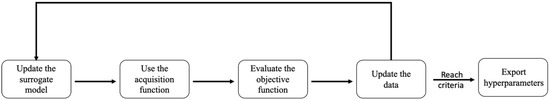 Initialization phase: This phase begins with a few random evaluations of the objective function to provide initial data for the surrogate model. Figure 2 illustrates the steps of the iteration optimization. There are 5 iterative optimization steps: (1) Update the surrogate model: With the data collected from previous evaluations, update the surrogate model; (2) Use the acquisition function: Based on the updated model, use the acquisition function to select the next dataset of hyperparameters to evaluate; (3) Evaluate the objective function: Train and validate the model using the selected hyperparameters and obtain the performance metric; (4) Update the data: Add the new result (hyperparameters and the corresponding performance metric) to the dataset (return to step (1) to update the surrogate model with the expanded dataset); (5) Export hyperparameters: Continue this process for a predefined number of iterations or until the improvement falls below a certain threshold.