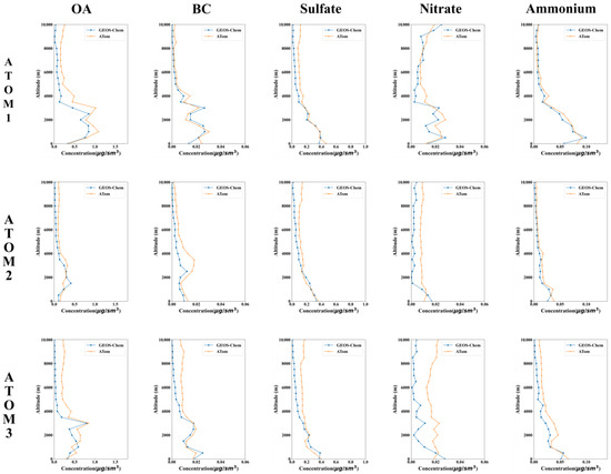 The mass concentration distribution of OA, BC, sulfate, nitrate, and ammonium with height is illustrated in Figure 4. GEOS-Chem generally underestimated the aerosol mass concentration in most scenarios. During the ATom-1 period (Northern Hemisphere summer), the mass concentration of BC and ammonium simulated by GEOS-Chem was relatively accurate. In the upper layers (>4000 m), GEOS-Chem underestimated OA, sulfate, and nitrate compared to ATom observations. In contrast, in the middle and lower layers (<4000 m), the BC, sulfate, and ammonium simulated by GEOS-Chem were close to observations, although the model underestimated the mass concentration of OA and nitrate. During the ATom-2 period (Northern Hemisphere winter), GEOS-Chem accurately simulated BC and sulfate; compared to observations, GEOS-Chem overestimated OA, nitrate, and ammonium in the lower layers (<2000 m). Except for accurately simulating the mass concentration of ammonium, GEOS-Chem underestimated the mass concentrations of OA, BC, sulfate, and nitrate in the middle and upper layers (>2000 m). During ATom-3 (Northern Hemisphere fall), in the lower and middle layers (<4000 m), GEOS-Chem’s performance in simulating BC was superior compared to its simulation of the other aerosols concerned. The simulations for the other four aerosols by GEOS-Chem all underestimated the mass concentration to some degree. In the upper layers (>4000 m), GEOS-Chem underestimated the mass concentrations of all five aerosols.