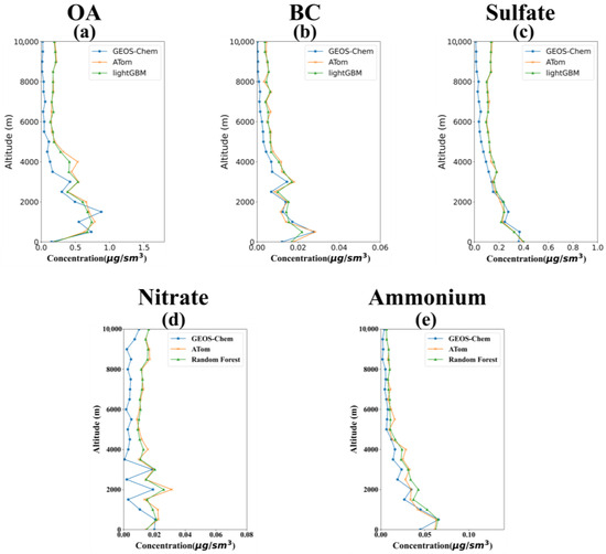 Height distribution of (a) OA, (b) BC, (c) sulfate, (d) nitrate, and (e) ammonium in the test dataset.