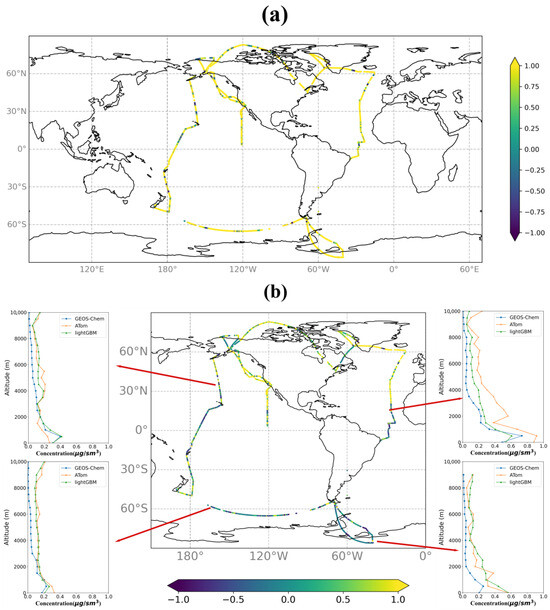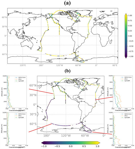 Refinement effects of the LightGBM algorithms for BC. (a) Relative error between observations and GEOS-Chem. (b) Relative error between observations and the refinement results (red arrows show the distribution of mass concentration with height in the corresponding areas: North Pacific, South Pacific, North Atlantic, and South Atlantic).
