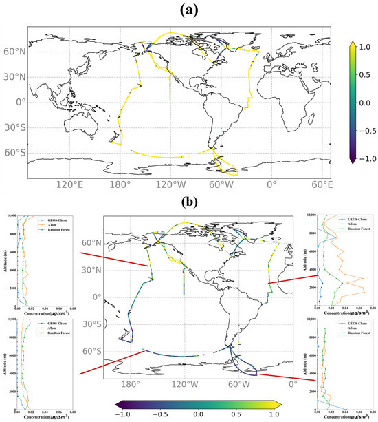 For BC, as shown in Figure 7, the Pacific Ocean benefited more from these corrections than the Atlantic; in the Northern Pacific, discrepancies were minimized except at altitudes between 2000 m and 3000 m. In the Southern Pacific, the algorithm tended to overestimate BC concentrations in the upper layers (above 8000 m) but achieved a better accuracy at other altitudes. In the Northern Atlantic, despite the algorithm’s correction of underestimation, a low bias remained in the lower and middle layers (below 5700 m), with more accurate simulations in the upper layers, which is similar with the refinement effect of ammonium using Random Forest. In the Southern Atlantic, the corrected model still slightly underestimated BC concentrations in the lower layers (<2500 m), while moving closer to observations in the middle and upper layers (>2500 m).