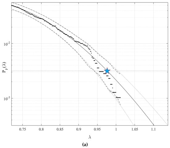 holding as probability function, similar to in Equation (6), with corresponding to the particular environmental ocean/sea short-term (e.g., 3 h) sea/ocean state [59]. For extreme (i.e., ) values, the probability-related functions, introduced above, are assumed to be regular within their PDF’s tail (). PDF frequently exhibits PDF tail’s behavior, often resembling