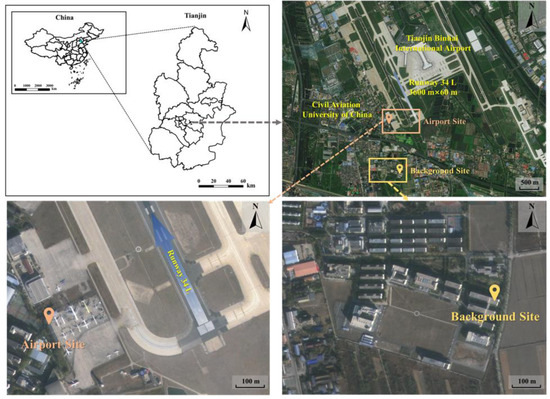 The sampling sites were situated on the rooftops of two school buildings on the Civil Aviation University of China campus in the southwest of the TSN (117°20′48″ E, 39°07′28″ N) (Figure 1). The airport site was located in a building about 600 m away from Runway 34 L of the TSN. This site is mainly impacted by aircraft emissions since it is a short distance from the airport. In addition, it may also be affected by road traffic as it is located near a major highway to the south of the airport (around 550 m). The background site was located approximately 1.70 km from the end of Runway 34 L. In addition to the influence of road traffic sources, background site may also be affected by the source of biomass burning or soil/construction dust due to the construction sites and fields. Other anthropogenic activities (e.g., coal burning) may also be conducive to particulate matter (PM) formation, since a university and residential areas with relatively high population density are located around these two monitoring sites. Meteorological data were obtained from the Meteorological Airport Database (METAR) of the China Meteorological Administration, including direction, wind speed, temperature, visibility, and atmospheric pressure.