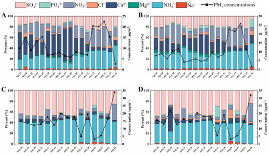 Daily variation in the mass concentrations of important WSIIs in PM1.0 measured at TSN at a (A) spring airport site, (B) spring background site, (C) summer airport site, and (D) summer background site.