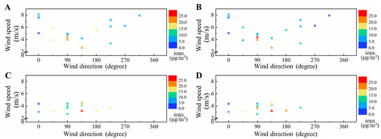 The wind speed significantly negatively correlated (airport site: r2 = −0.478; background site: r2 = −0.570) with WSIIs. This indicated that high wind speeds usually favored the dilution of pollutants and thus decreased WSII concentrations. In this study, lower wind speeds mainly occurred in the summer, with correspondingly high ion concentrations. This negative relationship between ion concentrations and wind speed was also found in other urban areas (e.g., Guangzhou, Hangzhou, and the Beijing–Tianjin–Hebei region) [10,41,42,43,44].