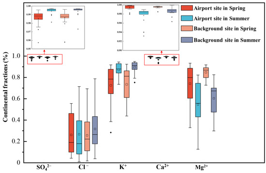 The continental contributions of , and accounted for more than 60% during the whole period. In comparison, was mainly from marine sources, while the marine fraction of varied in a comparatively large range from 27.68% to 82.99%. Airport emissions were a major source of pollution for the sampling site and contributed significantly to sulfate, nitrate, and ammonium levels. Sea salt sources also made a significant contribution to WSIIs, and the contribution showed an increase of 9.33% from spring to summer. Greater water vapor convergence due to the high temperature and rain in summer is the main reason for this phenomenon. The contribution of secondary inorganic aerosols showed a slightly increased tendency in summer, with values of 20.26% in spring and 21.42% in summer. Therefore, the management of secondary organic aerosols in summer requires more attention.