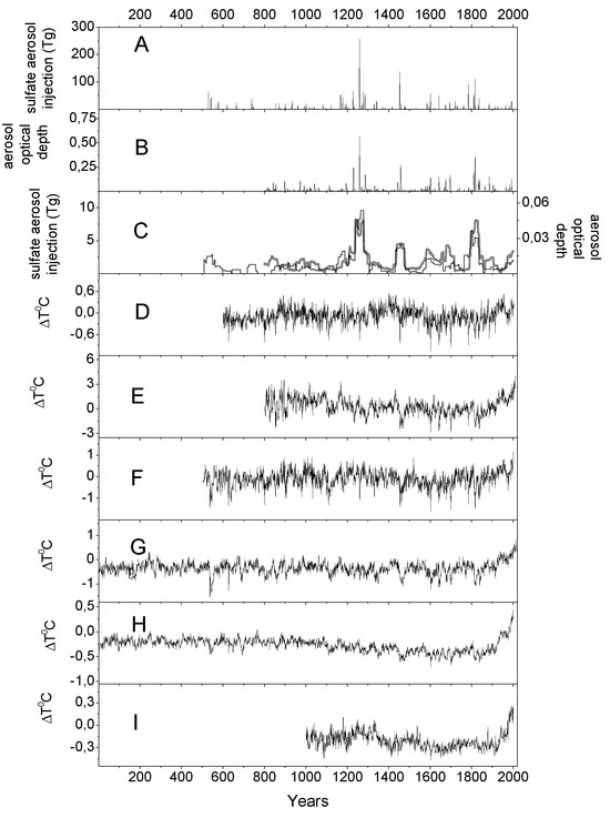 (A)—stratospheric sulfate aerosol injection [15]; (B)—aerosol optical depth at 550 nm [16]; (C)—sulfate aerosol injection (black line) and aerosol optical depth (gray line) smoothed by 40 years; (D)—temperature in NH (Schneider et al. [9]); (E)—temperature in NH (Wilson et al. [10]); (F)—temperature in NH (Guillet et al. [11]); (G)—temperature in NH (Büntgen et al. [12]); (H)—the median of the full 7000-member ensemble across all methods of the PAGES2k global temperature reconstructions [14]; (I)—temperature in SH [13].