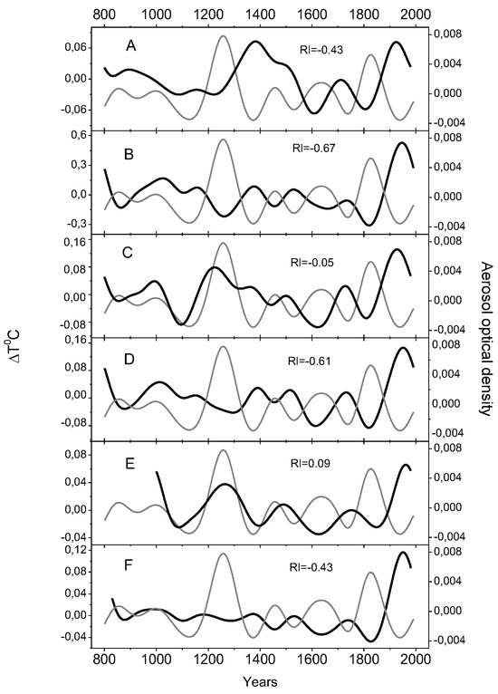 Different proxies, wavelet filtered in 171–272 yr scale band. Gray line—aerosol optical density; black lines: (A)—temperature in the NH. [9]; (B)—temperature in the NH. [10]; (C)—temperature in the NH. [11]; (D)—temperature in the NH. [12]; (E)—global temperature [14]; (F)—temperature in the SH. [13]. Temperature is shifted by 20 years.