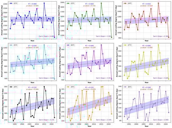 - Cao, J.; Shi, J.; Li, M.; Zhai, Z.; Zhang, R.; Wang, M. Variations of Cooling and Dehumidification Degree Days in Major Climate Zones of China during the Past 57 Years. Atmosphere 2023, 14, 752. [Google Scholar] [CrossRef]