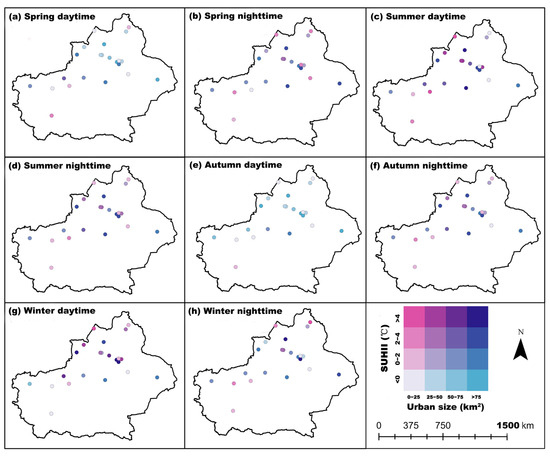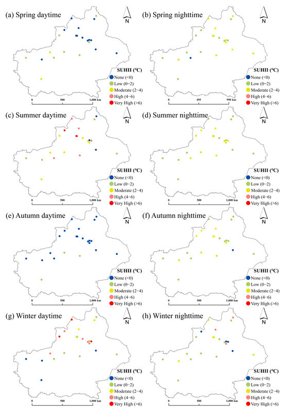 Spatial distributions of the SUHII in Xinjiang’s 22 major cities, including (a) the spring daytime SUHII; (b) spring nighttime SUHII; (c) summer daytime SUHII; (d) summer nighttime SUHII; (e) autumn daytime SUHII; (f) autumn nighttime SUHII; (g) winter daytime SUHII; and (h) winter nighttime SUHII.