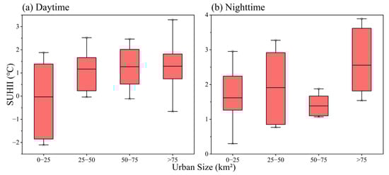 Figure 4 and Figure 5 illustrate the relationship between urban size and the SUHII. Urban size refers to the size of the urban built-up area, typically measured in km2. In the study area, the urban built-up area of the 22 cities ranges from 13.71 km2 (Aral) to 557.09 km2 (Urumqi), with an average of 76.59 km2. The cities are categorized into four groups based on size: 0–25 km2, 25–50 km2, 50–75 km2, and over 75 km2. Analyzing the SUHIIs of these cities reveals that larger cities exhibit a stronger SUHII during the daytime, while at nighttime, all cities except those in the 50–75 km2 category show a similar trend. The annual mean SUHIIs during the daytime for cities of 0–25 km2, 25–50 km2, 50–75 km2, and over 75 km2 are −0.03 °C, 1.17 °C, 1.27 °C, and 1.29 °C, respectively. During the nighttime, the annual mean SUHIIs for these categories are 1.62 °C, 1.91 °C, 1.38 °C, and 2.56 °C. This indicates the presence of a UHI during the daytime in cities larger than 25 km2 and during the nighttime in cities of all sizes.