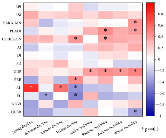 Overall, the daytime SUHII of Xinjiang cities exhibited a notable correlation with topographic factors, specifically AL and EL. The spring and autumn SUHIIs showed positive correlations with AL, while the summer and winter SUHIIs displayed negative correlations with both AL and EL. Furthermore, during winter, the daytime SUHII also demonstrated significant positive correlations with PRE and COHESION. Notably, there was a significant positive correlation between the nighttime SUHII and GDP across all cities in Xinjiang. Additionally, the summer nighttime SUHII exhibited significant positive correlations with PLADJ and COHESION, while the winter nighttime SUHII displayed positive correlations with PARA_MN and PLADJ, along with a negative correlation with the UGSR.