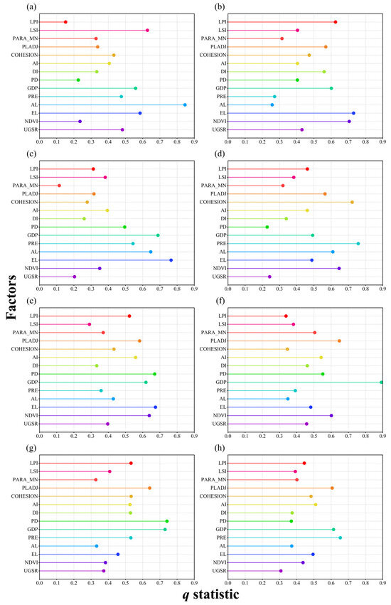 Detecting the impact of a single factor on the SUHII using the OPGD model. including (a) the spring daytime; (b) summer daytime; (c) autumn daytime; (d) winter daytime; (e) spring nighttime; (f) summer nighttime; (g) autumn nighttime; and (h) winter nighttime.