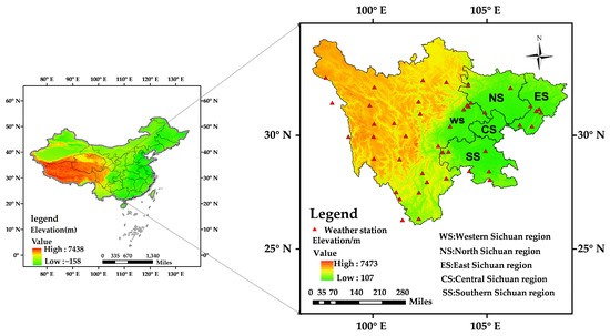Sichuan Province in southwestern China (97°21′ E to 108°12′ E, 26°03′ N to 34°19′ N) spans 486,000 square kilometers (Figure 1). It includes five major geomorphic units: the Sichuan Basin, Qinghai–Tibet Plateau, Hengduan Mountains, Yunnan–Guizhou Plateau, and Qinling–Daba Mountains. The terrain is higher in the west and lower in the east, with an average elevation of approximately 2500 m and a maximum elevation difference exceeding 6 km [24,25,26]. The significant topographical variations and differing monsoon circulation patterns contribute to a rich and diverse climate in Sichuan Province, exhibiting marked spatial variation [27]. The western plateau and mountainous areas are characterized by a cold temperate climate, with cold winters and cool summers, abundant sunshine, an average annual temperature ranging from 4 to 12 °C, and annual precipitation between 500 and 900 mm; the eastern basin features a subtropical monsoon climate, with warm winters and hot summers, less sunshine, an average annual temperature of 16–18 °C, and annual precipitation ranging from 1000 to 1300 mm [28]. The region boasts a variety of vegetation types, primarily subtropical shrublands, evergreen broad-leaved forests, and alpine meadows on the plateau mountains. This paper divides Sichuan Province into five regions—West Sichuan (WS), North Sichuan (NS), East Sichuan (ES), Central Sichuan (CS), and South Sichuan (SS)—based on administrative divisions for the study.