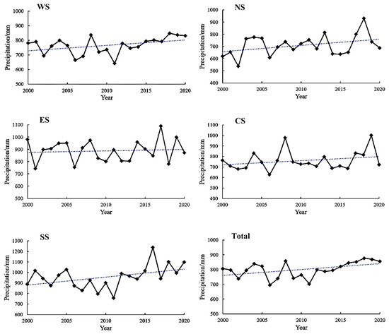 Temporal changes in precipitation of Sichuan Province during 2000–2020. (West Sichuan (WS); North Sichuan (NS); East Sichuan (ES); Central Sichuan (CS); South Sichuan (SS); Total: Sichuan).