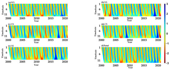 When analyzing the influencing factors of vegetation, we should not only consider single factors, such as precipitation, air temperature, and sunshine hours, but also comprehensively consider the influence of multiple meteorological factors on vegetation growth. The multi-timescale SPEI value can clearly reflect regional dry and wet evolution and the status of available water resources. Figure 5 shows the multi-scale SPEI for each sub-region of Sichuan Province from 2000 to 2020. It can be seen that when the cumulative time scale is small, the SPEI fluctuates sharply, with obvious alternation between wet and dry conditions. As the cumulative time scale increases, the SPEI fluctuations weaken, showing consecutive dry and wet periods. The annual-scale SPEI can clearly indicate the switch between dry and wet periods. Sichuan Province was generally wet from 2000 to 2020, but there were dry periods in 2006–2007 and 2011–2012, with higher degrees of dryness. The wet–dry alternation in the WS region is pronounced, and it is wetter compared to other regions. The SS region experienced a relatively arid period from 2006 to 2012, with prolonged droughts. After 2015, the climatic conditions in this area gradually became wetter, with rarely occurring significant droughts. The CS region saw notable droughts in 2003, 2008, and 2020, with moderate to severe drought conditions in 2020. The ES and NS experience more frequent wet–dry alternations, but the droughts are relatively mild and have shorter durations.