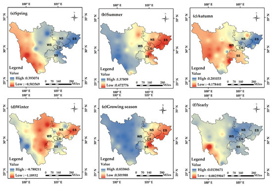 The average temperatures for each season in Sichuan Province over the past 21 years are shown in Table 2. The average temperatures in each season in NS, ES, and CS were generally higher than those in WS and SS, and WS had the lowest temperatures in all seasons, which was due to the fact that most of the geographic location of WS is at high altitude, where the air is thin, and heat is lost quickly, resulting in lower temperatures. During the growing season, regional temperatures are ranked as follows: ES (24.86 °C) > CS (24.11 °C) > NS (23.72 °C) > SS (21.99 °C) > WS (16.58 °C).