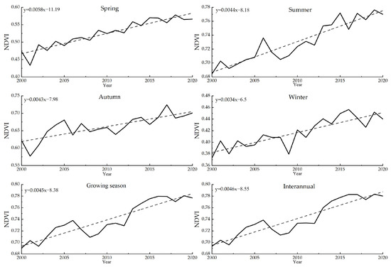 Figure 7 illustrates the temporal dynamics of the NDVI in Sichuan Province. Overall, the province experienced a steady upward trend in the NDVI on both the intra-annual and inter-annual scales. However, from 2006 to 2013, the NDVI growth slowed or declined in some periods, particularly during the growing season and on the inter-annual scale. Over the past 21 years, the summer NDVI fluctuated between 0.684 and 0.776, with a multi-year average of 0.728. The peak value occurred in 2019, while the lowest was in 2000, showing a gradual upward trend of 0.0045 per year. The winter NDVI ranged from 0.372 to 0.456, with an average of 0.415. The highest winter value was recorded in 2016, and the lowest in 2000. The NDVI trends during the growing season and on an inter-annual scale were similar, with multi-year averages of 0.737 and 0.739, respectively. The multi-year mean values of the NDVI for all seasons in Sichuan Province, from the largest to the smallest, were as follows: summer (0.728) > autumn (0.659) > spring (0.522) > winter (0.415). In winter, due to low temperatures, limited precipitation, and short sunshine hours, the NDVI growth rate was the smallest, and vegetation cover was the lowest throughout the year. In spring, the temperature warmed up, the precipitation increased, and vegetation cover gradually increased. The NDVI growth rate in the growing season was the largest, and its multi-year average value was the highest for the year.