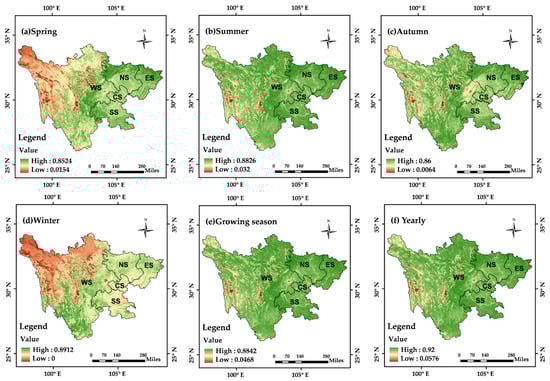 Mean spatial distribution of NDVI in Sichuan Province. (a–f) indicate the average NDVI distribution in Sichuan Province from 2000 to 2020 for spring, summer, autumn, winter, the growing season, and yearly periods, respectively.
