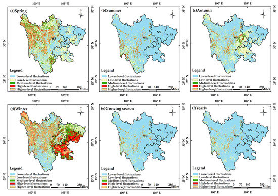 The intra-annual and inter-annual NDVI fluctuation characteristics in Sichuan Province from 2000 to 2020 are shown in Figure 9. The NDVI in Sichuan Province mostly fluctuates at a low level, especially in the NS, ES, and SS, while the central and western regions of WS exhibit significant fluctuations. This is mainly due to the economic backwardness of WS, where economic development is dominated by agriculture, and the degradation of vegetation cover is caused by unreasonable farming methods. In spring, the northwest and central regions of WS have higher fluctuations; in summer, fluctuations in the whole province decline, and the vegetation cover is relatively stable, but some areas in the central part of WS still have higher-level fluctuations; in autumn, the fluctuation levels in the eastern part of WS, the southwestern part of NS, and the northern part of SS shift from low to lower; in winter, the fluctuation level of the whole province increases comprehensively, mainly concentrated in most areas of WS, NS, ES, and SS, with lower stability of vegetation cover; and the fluctuation changes in the growing season are consistent with those of the whole year, with a small number of areas in the western and central parts of WS still having high-level fluctuations and other areas having low-level fluctuations. The fluctuation in summer is the lowest compared with other seasons because the vegetation grows vigorously in summer, and the vegetation cover is high. The highest fluctuation in winter is due to the low temperatures and precipitation in winter, the non-vegetation growing season, withering leaves, and low vegetation cover.
