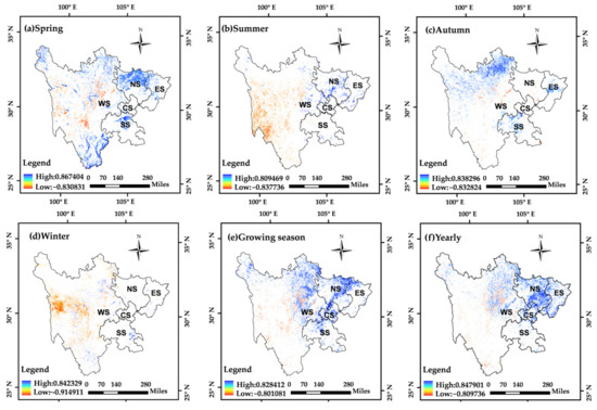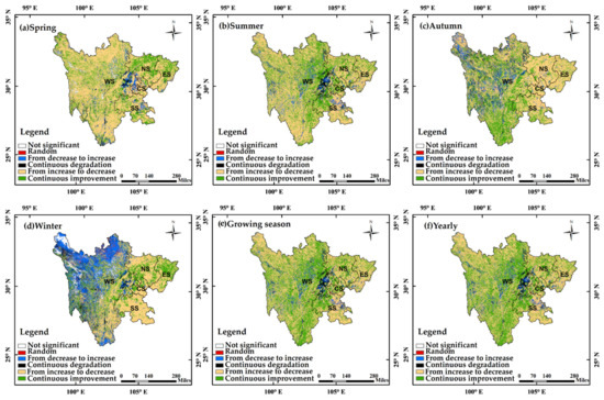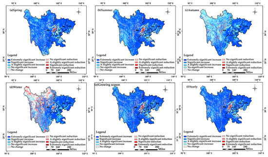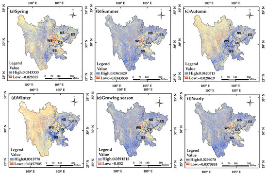 Spatial analysis of vegetation change trends across Sichuan Province. (a–f) represent the vegetation cover change trends in Sichuan Province from 2000 to 2020 for spring, summer, autumn, winter, the growing season, and annual periods, respectively.