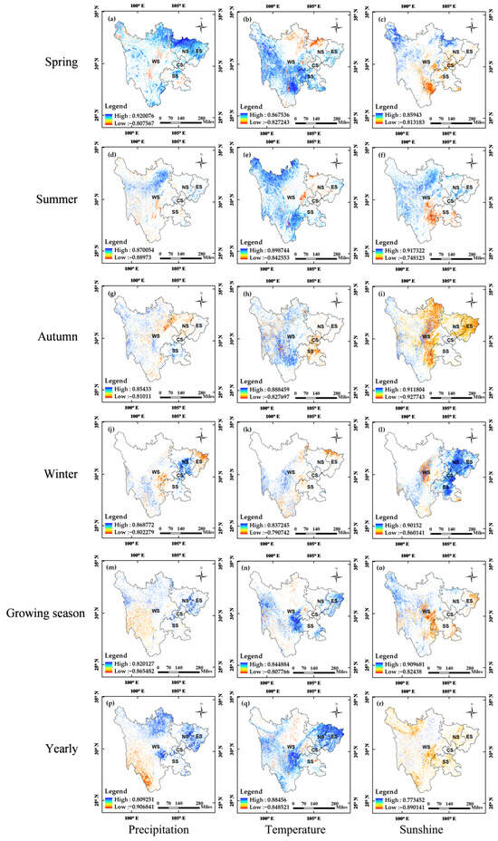 The spatial distribution of the partial correlation coefficients between the NDVI and temperature, precipitation, and sunshine hours in Sichuan Province from 2000 to 2020 that passed the significance test is shown in Figure 13. In spring, the NDVI is primarily positively correlated with temperature, accounting for 91.87% of the area, mainly distributed in WS and SS. The NDVI is mainly positively correlated with precipitation, covering an area of 93.6%, mainly located in WS, NS, and CS. The NDVI is primarily positively correlated with sunshine hours, accounting for 59.73% of the area, distributed in the northwestern part of WS and NS.