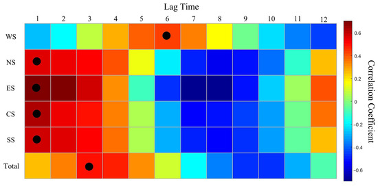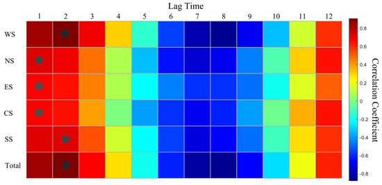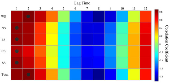 The partial correlation coefficients of the monthly NDVI and sunshine duration in Sichuan Province from 2000 to 2020 are shown in Figure 16. The lag time of the NDVI’s response to sunshine duration in Sichuan Province is two months. The shorter response times of the NDVI to precipitation and temperature indicate that vegetation growth is more sensitive to these factors. The correlation between the NDVI and sunshine duration is weakest in WS, with the longest lag at five months. In NS, ES, CS, and SS, the response of the NDVI to sunshine duration mainly lags by zero months, with the strongest correlation between the NDVI and sunshine duration found in CS. The impact of sunshine duration on vegetation has a time lag primarily because plant growth and development require time to accumulate in response to light exposure. This involves energy conversion through photosynthesis, the combined effects of environmental factors, photoperiodism, regulation by plant hormones, and the response speeds of different growth organs.