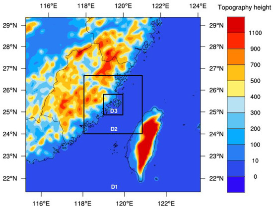The WRF model is the most popular and advanced atmospheric simulation system for meteorological research and numerical weather prediction, with simulations ranging from small to medium to global scales. Its numerical calculation dynamic framework is primarily divided into the Nonhydrostatic Mesoscale Model (NMM) module for numerical prediction and the Advanced Research WRF (ARW) module for scientific investigation [10]. In this investigation, the WRF version 4.0 ARW-driven mesoscale meteorological model was utilized. Figure 1 depicts three nest domains utilized in WRF simulations and centered at 25.44° N and 119.45° E. Among them, the outer nested domain (D1) covers the whole of Fujian Province, with a horizontal spatial resolution of 9 Km and a total of 103 × 103 grids; the middle nested domain (D2) covers Fuzhou, the provincial capital of Fujian Province, which is composed of 103 × 103 grids with a resolution of 3 Km; and the inner nested domain (D3), which is the area of major concern, covers Fuqing City, and is made up of 103 × 109 grids with a resolution of 1 Km. A total of 48 vertical levels are used, and the height of the first layer of grids at the bottom is 10 m; the height of each subsequent layer of grids is increased by 20% until the height reaches 1 Km, and the grids are distributed among 17 layers below 1 Km. The model was integrated for 36 h, from 12:00 on 3 June 2019, to 24:00 on 4 June 2019. The first 12 h were spin-up time, and the meteorological data from the subsequent 24 h were analyzed as the accurate calculation results. The model’s temporal steps from the outer nested domain to the inner nested domain were 36 s, 12 s, and 4 s. The initial and boundary conditions for WRF simulations are derived from the National Center for Environmental Prediction (NCEP) Final (FNL) Operational Global Analysis data, which is provided at 0.25° × 0.25° spatial resolution and 6 h temporal resolution (https://rda.ucar.edu/datasets/ds083.3/. Accessed on 17 November 2024). In addition, LULC and terrain data sets are updated to overcome the errors caused by changes in the underlying surface of the terrain in recent years. Among these, LULC data sets use the 300 m spatial resolution data set published by the European Centre for Medium-Range Weather Forecasts in 2020 (https://cds.climate.copernicus.eu/datasets/satellite-land-cover?tab=download. Accessed on 17 November 2024), while terrain data use SRTM data set released by NASA (https://srtm.csi.cgiar.org/srtmdata/. Accessed on 17 November 2024). The WRF model offers several physical process parameterization schemes, including the MP scheme, the PBL scheme, the CU scheme, the LSF scheme, the LW radiation scheme, and the SW radiation scheme. Each physical process parameterization scheme is set using the experimental method outlined in Section 3.2.