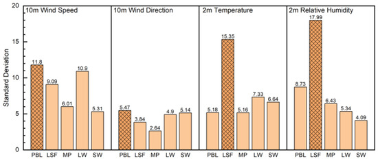 Distribution of standard deviation of each physical processes to simulate different meteorological variables (10 m wind speed, 10 m wind direction, 2 m wind temperature, and 2 m relative humidity). The factors with the largest standard deviation of each meteorological variable are highlighted with a grid.