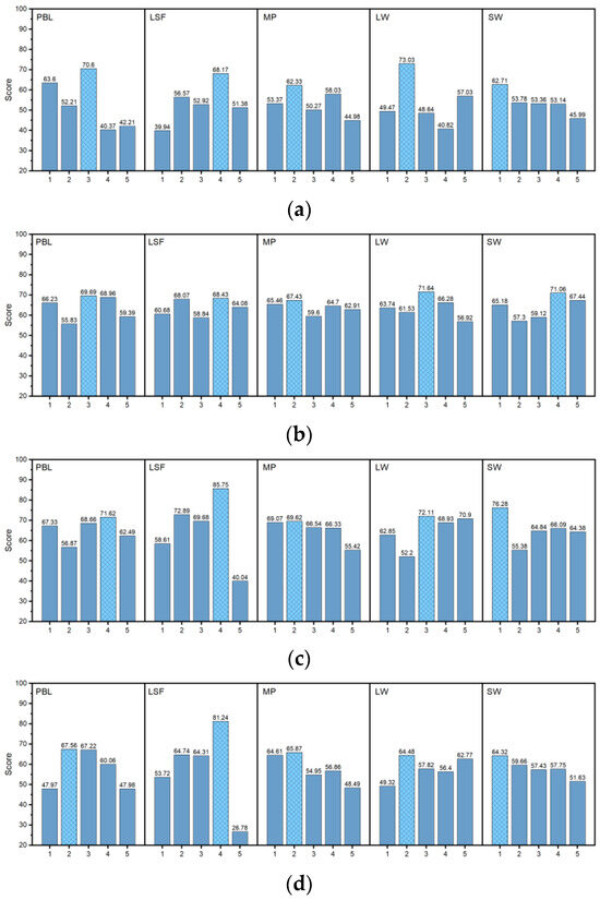 The distribution of the average comprehensive scores of each physical parameterization scheme to simulate the meteorological variable: (a) 10 m wind speed, (b) 10 m wind direction, (c) 2 m wind temperature, and (d) 2 m relative humidity. As shown in Table 1, the numbers of each physical process correspond to the specific parameterization schemes. The parameterization scheme with the highest score in each physical process is highlighted with a grid.