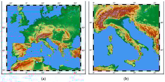 CHIMBO integration domains: Europe (a) and Italy (b) with horizontal cell grids of ca. 20 km and ca. 8 km, respectively. The different colors indicate the orography: the sea surface is depicted in blue, brown shades for higher altitudes and green shades for lower altitudes or flat terrains are used.