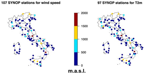 Locations of SYNOP-Land station for Italian peninsula where wind speed (left panel) and 2 m temperature (right panel) are measured and considered for this work. Color bar indicates the altitude of sampling sites.