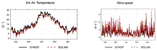 We compared the time series of 2 m temperature and wind speed at 10 m predicted by the BOLAM meteorological model with SYNOP-Land measurement stations. These measures are representative of processes affecting the synoptic scale and are particularly suitable for comparing modeling simulations performed on the mesoscale domain. Figure 4 shows the time series of daily mean values comparisons of the above-mentioned meteorological variables for the period December 2018–February 2020.