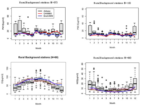The comparisons of observed monthly median concentrations of PM10, PM2.5, O3 and NO2 (box plot (black and gray colors) with median, 25th and 75th percentiles and outliers), calculated by the CHIMBO modeling chain (red line) and the CAMS ensemble (blue line) are reported. The stations considered for this comparison are all those available nationwide for the year 2019 and representative of rural background conditions. In general, CHIMBO seems to have similar performances to the CAMS ensemble.
