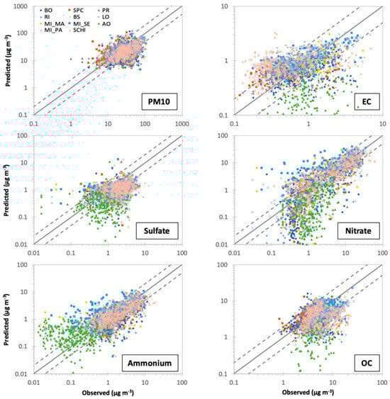 Comparison of predicted vs. observed PM10 mass and PM10/PM2.5 main chemical components concentrations (μgm−3) from 11 measurement stations in Northern Italy during 2019. Each point corresponds to a 1-day average value. Also shown are the 1:1, 2:1 and 1:2 lines. Observed data represent gravimetric and chemical measurements. Carried out by ARPAs on filter samples.