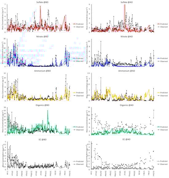 In some background sites, however, even if on average the agreement between measured and simulated concentrations is good, there are some seasonal discrepancies. In Bologna, for example (as shown by the time series in Figure 7), we have an overestimation of OC during the summer and a strong underestimation during the winter. This can be the result of the possible overestimations in the emission/formation factors of biogenic OC during the summer and the underestimation (or total lack) of some sources of OC and EC during the winter. A possible explanation of this winter-time EC and OC underestimation can be related to the missing representation in the model of the ageing processes of biomass combustion emissions from domestic heating, recently suggested as an overlooked source of winter SOA by several experimental [,,,] and modeling studies [,,].