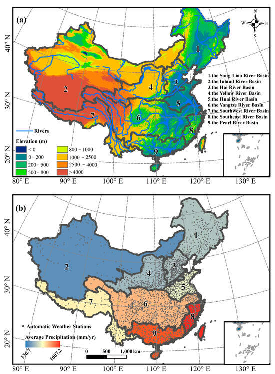 (a) Division map of the nine major river basins in China, with each basin numbered from 1 to 9. (b) Multi-year average rainfall distribution of each basin. The nine basins are identified as follows: 1—Song-Liao River Basin, 2—Inland River Basin, 3—Hai River Basin, 4—Yellow River Basin, 5—Huai River Basin, 6—Yangtze River Basin, 7—Southwest River Basin, 8—Southeast River Basin, and 9—Pearl River Basin.