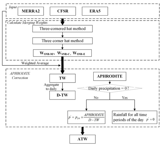 This paper aims to obtain a more accurate precipitation dataset based on MERRA2, CFSR, ERA5, and APHRODITE. The improved approach and steps are as follows: