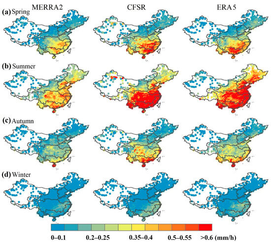The uncertainty of MERRA2, CFSR, and ERA5 at a 0.1° × 0.1° resolution for the period from 2008 to 2011 was calculated using the generalized three-cornered hat method and is illustrated in Figure 3. Due to significant differences in accuracy across time and space, this study calculates uncertainty based on seasons and river basins. MERRA2 consistently exhibits lower uncertainty than other products across all four seasons, particularly in the lower reaches of the Yangtze River and in southern China, where uncertainty is highest. MERRA2 reported the lowest rainfall error, and in a previous study by Xu et al. [38] on global monthly rainfall errors, MERRA2 also showed the lowest rainfall error. It is important to note that the magnitude of uncertainty is related to the average rainfall of the target grid, and since true values are unknown, first-order systematic bias cannot be computed; therefore, the uncertainty estimated based on TCH should be less than that estimated from true values.