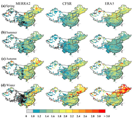 The spatial distribution of the SNR for each product from 2008 to 2011 is depicted in Figure 4. For each individual product, the SNR is determined as the ratio between the standard deviation of the rainfall time series for each grid and the uncertainty identified in Figure 3. The standard deviation represents the useful information (signal) present in the dataset, while the uncertainty quantifies the level of noise. A higher SNR indicates that the dataset contains a more substantial amount of useful signal compared to noise, thereby suggesting greater accuracy and reliability of the product. Conversely, a lower SNR suggests that noise dominates, reducing confidence in the data’s accuracy and reliability. In cases where the SNR is less than 1, it implies that the noise level surpasses the signal in that grid point, rendering the data less dependable. These regions are marked with hollow circles in Figure 4 to highlight areas where the information-to-noise ratio is less favorable. The results indicate that while MERRA2 generally exhibits the lowest uncertainty, its SNR is lower than that of the other two products across most regions, particularly during winter. However, in the northern region, and specifically in the Song-Liao River Basin, MERRA2 demonstrates a higher SNR compared to the other products during the spring and autumn seasons. In the southwestern river basins and the upper reaches of the Yangtze River during winter, MERRA2 exhibits a large area with an SNR of less than 1. In contrast, ERA5 shows the highest SNR, particularly in the Song-Liao River Basin during winter, where high signal values are evident.